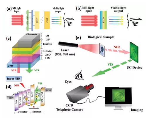 紅外探測器在環(huán)境監(jiān)測、軍事、生物等領域有著巨大應用潛力,特別是紅外上轉換器件無需后端讀出電路制備簡單成本較低,成為目前探測領域關注的熱點。遺憾的是,受限于目前上轉換器件的低光光轉換效率、高能耗、弱光響應較差以及成像線性動態(tài)范圍(I-LDR,工作在開啟狀態(tài)),高質量的上轉換成像幾乎沒有報道。在過去的二十年中,已經開發(fā)了基于有機、無機和有機/無機雜化半導體的各種上轉換器件,無機上轉換器件中發(fā)射和探測單元之間通常需要晶格匹配和晶圓融合技術,因此存在光光轉換效率低和制造成本高的問題。有機/無機雜化上轉換器件集成了有機發(fā)光二極管和無機光電探測器,可以通過更方便的制備過程實現(xiàn)更高的光光轉換效率,但它們受高結合能的影響,因此在弱光檢測中表現(xiàn)不佳。