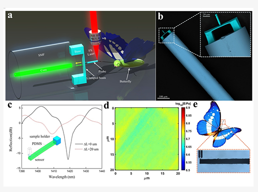 進(jìn)一步,他們利用該傳感器實(shí)現(xiàn)了對(duì)聚二甲硅氧烷(PDMS)材料樣本和蝴蝶觸角等生物樣本楊氏模量的精確測(cè)量(圖1)。