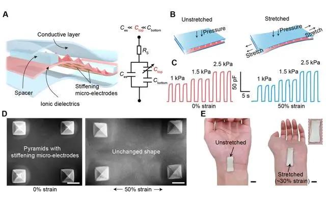 該傳感器利用可拉伸離子凝膠材料作為壓力傳感介電層的獨(dú)特機(jī)理,結(jié)合微米尺度的結(jié)構(gòu)設(shè)計(jì)與力學(xué)設(shè)計(jì),將器件的拉伸形變與壓力檢測中的壓縮形變解耦,實(shí)現(xiàn)了在50%應(yīng)變范圍內(nèi)98%的壓力檢測的對拉伸不敏感度。同時(shí),該壓力傳感器的最低檢測限低至0.2 Pa,且可以在有預(yù)壓力(1 kPa)的情況下,準(zhǔn)確檢測30 Pa的壓力增量。另外,該傳感器可以在500次重復(fù)拉伸下,仍然保持與初始狀態(tài)基本一致的壓力傳感性能與對拉伸不敏感度。