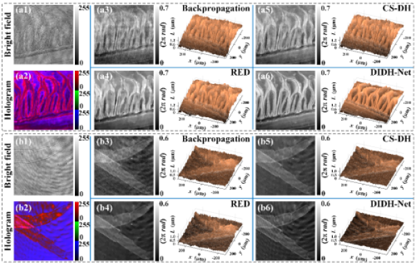 針對上述問題,課題組提出了用于DIDH成像的非訓(xùn)練神經(jīng)網(wǎng)絡(luò)即DIDH-Net,可從DIDH成像數(shù)據(jù)中重建出噪聲和孿生像雙重抑制的目標(biāo)相位分布。DIDH-Net本質(zhì)上是通過將非卷積網(wǎng)絡(luò)與真實(shí)成像物理過程模型相結(jié)合而建立,即將神經(jīng)網(wǎng)絡(luò)成像結(jié)果與用于光學(xué)DIDH成像的特定模型相結(jié)合,從而避免了傳統(tǒng)網(wǎng)絡(luò)訓(xùn)練所需的極大數(shù)據(jù)量。此外,該DIDH-Net不需要對成像參數(shù)或操作(如相移、訓(xùn)練數(shù)據(jù)等)進(jìn)行額外的修改,便可實(shí)現(xiàn)高分辨率和高精度相位成像和測量。