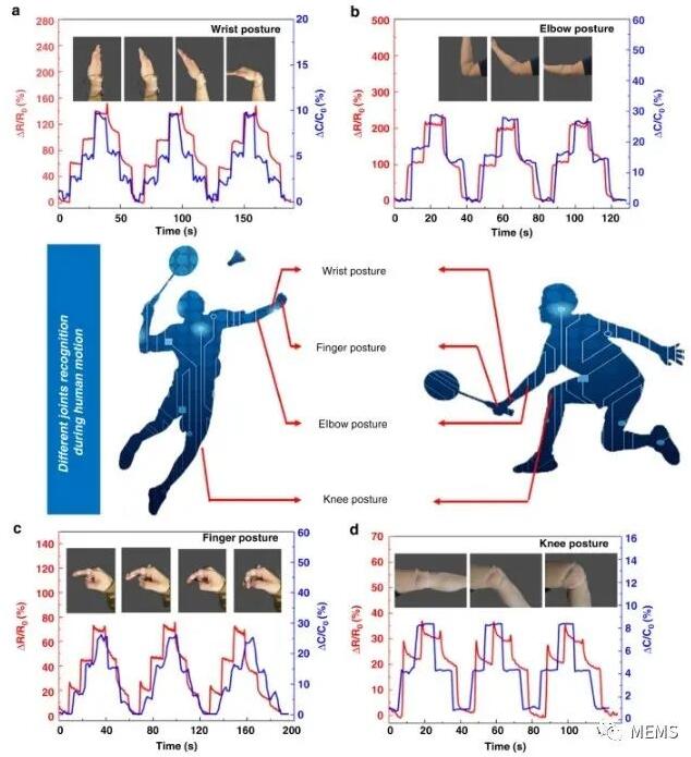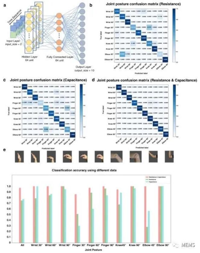 為了證明SRCSM傳感器在可穿戴電子領(lǐng)域的巨大應(yīng)用潛力,研究人員測量了由人體運動引起的關(guān)節(jié)彎曲(手指、肘部、手腕和膝蓋)的實時物理信號。此外,由于SRCSM傳感器的解耦雙信號輸出特性,研究人員通過長短期記憶網(wǎng)絡(luò)(long short-term memory,LSTM)深度學(xué)習(xí)算法對不同關(guān)節(jié)不同姿勢的電子信號進行分類,以進行識別訓(xùn)練。結(jié)果表明,當(dāng)同時使用電阻和電容數(shù)據(jù)時,手指關(guān)節(jié)彎曲30°、膝關(guān)節(jié)彎曲45°、肘關(guān)節(jié)彎曲45°的分類準(zhǔn)確率分別為94.64%、97.78%和94.44%。此外,其他關(guān)節(jié)姿勢的分類準(zhǔn)確率達到了100%。僅使用電阻數(shù)據(jù)、電容數(shù)據(jù)以及同時使用電阻和電容數(shù)據(jù)的整體分類準(zhǔn)確率分別為74.79%、77.36%和97.13%,這表明SRCSM傳感器在區(qū)分姿勢方面的分類準(zhǔn)確率最高。因此SRCSM傳感器在科學(xué)運動訓(xùn)練、創(chuàng)新醫(yī)學(xué)和其他領(lǐng)域具有顯著優(yōu)勢。
