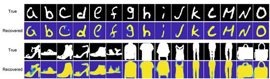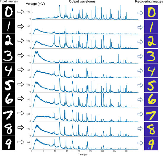 通過(guò)超快光電探測(cè)器可以獲得脈沖串波形,經(jīng)神經(jīng)網(wǎng)絡(luò)模型進(jìn)行訓(xùn)練后,可以直接從不同的脈沖波形中恢復(fù)出被探測(cè)圖像。圖3展示了來(lái)自不同數(shù)據(jù)庫(kù)中圖案的成像效果。