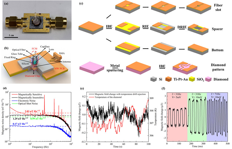 小型化、集成化、便攜化是鉆石量子傳感器取得實際應(yīng)用的重要條件。該團隊基于晶圓級微機電工藝平臺,利用標(biāo)準(zhǔn)微納加工技術(shù),制備出鉆石量子磁傳感器的核心——鉆石芯片。芯片內(nèi)部集成了微波輻射結(jié)構(gòu),實現(xiàn)了原位微波量子態(tài)操控。采用金屬熱壓鍵合技術(shù)實現(xiàn)了鉆石單晶與硅晶圓的異質(zhì)集成,確保了機械穩(wěn)定性。鉆石芯片耦合帶有梯度變化折射率透鏡的光纖模塊,實現(xiàn)了“光進(jìn)光出”的工作模式,大大縮小了探頭尺寸,實現(xiàn)了鉆石磁強計探頭的高集成度。并進(jìn)一步指出,采用雙頻共振技術(shù)可以同時進(jìn)行磁場和溫度場的同步實時測量,不僅通過溫漂抑制提高了磁場測量的信噪比,還確保了傳感器的溫度穩(wěn)定性。