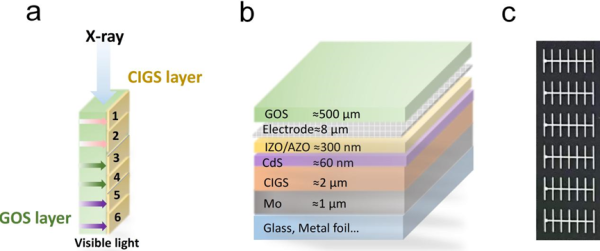 圖1 a 3D結(jié)構(gòu)間接型X射線探測器的示意圖;b CIGS光電功能層的器件結(jié)構(gòu);c 光電器件的照片。