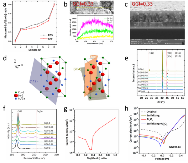 圖2 a 研究中使用的CIGS薄膜的Ga/(Ga+In)元素比;b Ga含量0.33的樣品中各元素的空間分布;c CIGS吸收層的截面電子顯微鏡照片;d CIGS的晶體結(jié)構(gòu)示意圖;e CIGS薄膜的晶體X射線衍射圖譜;f CIGS薄膜的拉曼光譜;g CIGS光電器件的暗電流與Ga組分關(guān)系;h 表面鈍化處理后的CIGS器件的電流電壓曲線。