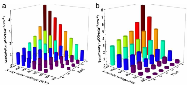 為了獲得對于X射線的能量分辨能力,該研究提出了新的3D結(jié)構(gòu)X射線探測器的幾何構(gòu)型,新結(jié)構(gòu)一方面可以利用X射線在穿透深度上的空間分辨獲得能量分布信息,另一方面可以使閃爍體的可見光熒光信號傳播方向與X射線傳播方向垂直,成功解決了間接型X射線探測器在高靈敏度和高空間分辨率不可兼得的難題。