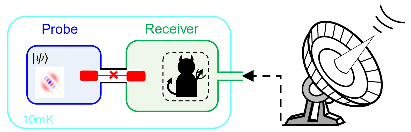 前述實(shí)驗(yàn)中的樣品由一個(gè)超導(dǎo)量子比特分別和兩個(gè)微波諧振腔耦合而組成(如圖1所示),兩個(gè)微波諧振腔中壽命高的作為探測(cè)腔,壽命低的作為接收腔。研究人員先將探測(cè)腔內(nèi)的光場(chǎng)態(tài)制備到不同光子態(tài)的疊加態(tài)上,該狀態(tài)是一個(gè)典型的奇異量子態(tài);再用接收腔接收外界信號(hào)源發(fā)射的微波信號(hào),通過(guò)兩個(gè)腔之間的相互作用,探測(cè)腔內(nèi)光場(chǎng)疊加態(tài)的相對(duì)相位會(huì)隨著時(shí)間積累;最后通過(guò)讀取探測(cè)腔內(nèi)光場(chǎng)態(tài)的相位信息,測(cè)得接收腔內(nèi)微波信號(hào)強(qiáng)度。