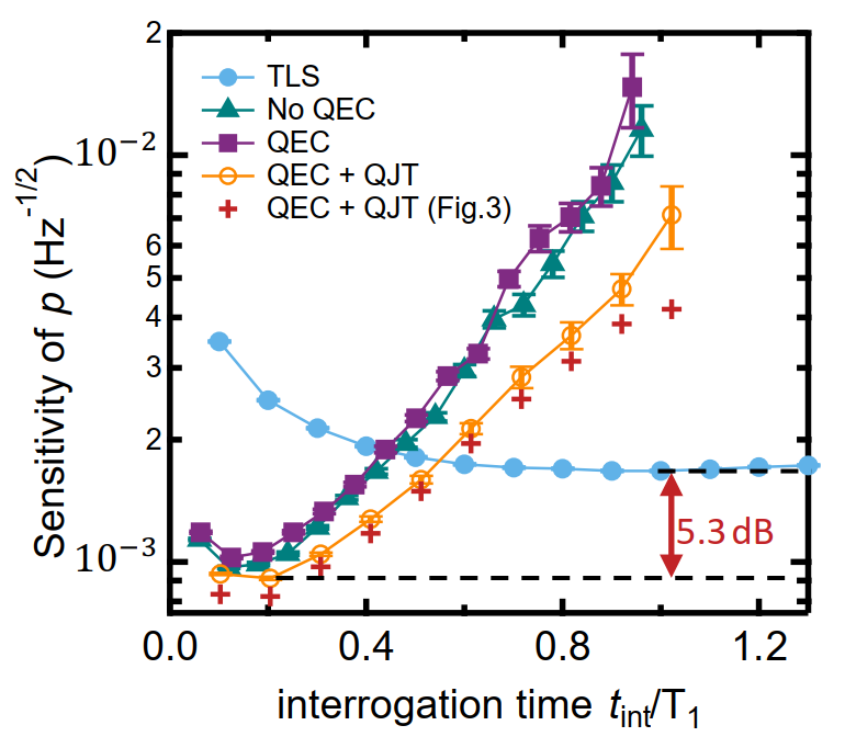 同時(shí),在探測(cè)過(guò)程中,為了抵抗環(huán)境噪聲引起的接收腔內(nèi)光場(chǎng)疊加態(tài)的退相干影響,前述團(tuán)隊(duì)在單次實(shí)驗(yàn)中多次使用了近似量子糾錯(cuò)操作,并能跟蹤錯(cuò)誤發(fā)生的次數(shù),從而增強(qiáng)了其量子精密測(cè)量方案可達(dá)到的測(cè)量靈敏度(如圖2所示)。