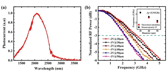 圖1.鍺錫探測(cè)器的(a)光響應(yīng)譜;(b)頻率響應(yīng)譜