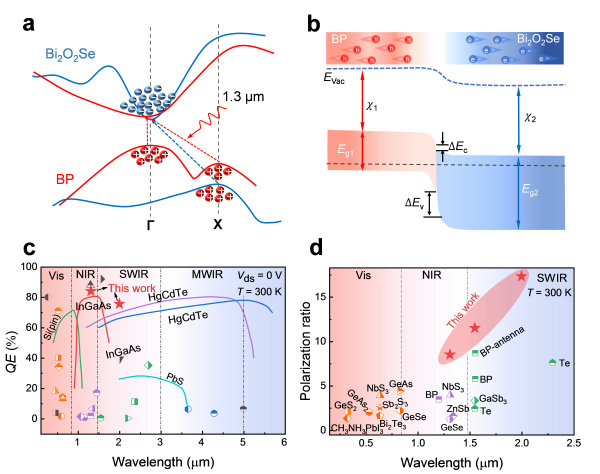 在本論文研究中,作者們創(chuàng)新性地將新型能動(dòng)量匹配范德華異質(zhì)結(jié)應(yīng)用于紅外探測(cè)器技術(shù)。研究顯示,二維半導(dǎo)體黑磷(BP)的價(jià)帶頂和硒氧化鉍(Bi2O2Se)的導(dǎo)帶底位于布里淵區(qū)的Γ點(diǎn)(圖2a),光生載流子在界面處能直接躍遷到BP和Bi2O2Se的導(dǎo)帶,提高了光生載流子的躍遷幾率和產(chǎn)生率。BP和Bi2O2Se形成了完美的Ⅱ類能帶結(jié)構(gòu)(圖2b),進(jìn)而提高了光生載流子的收集效率。本研究制備的能動(dòng)量匹配BP/Bi2O2Se異質(zhì)結(jié)紅外探測(cè)器實(shí)現(xiàn)了與傳統(tǒng)材料紅外探測(cè)器相比擬的量子效率,在1.3μm時(shí)量子效率達(dá)到84%,在2μm時(shí)量子效率達(dá)到76.5%(圖2c)。此外,該BP/Bi2O2Se異質(zhì)結(jié)紅外探測(cè)器實(shí)現(xiàn)了較高的偏振特性,在短波紅外波段偏振比達(dá)到17(圖2d)。