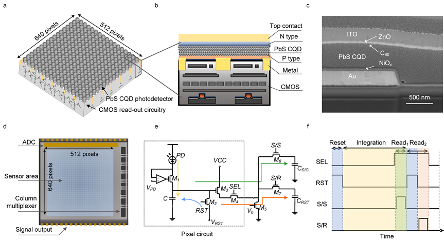 PbS CQD成像芯片。a) 成像芯片整體示意圖;b) 成像芯片橫截面示意圖;c) 成像芯片的橫截面掃描電鏡圖像;d) 成像芯片的俯視示意圖;e) 單個(gè)像素的電路圖;f) 電路的讀出時(shí)序
