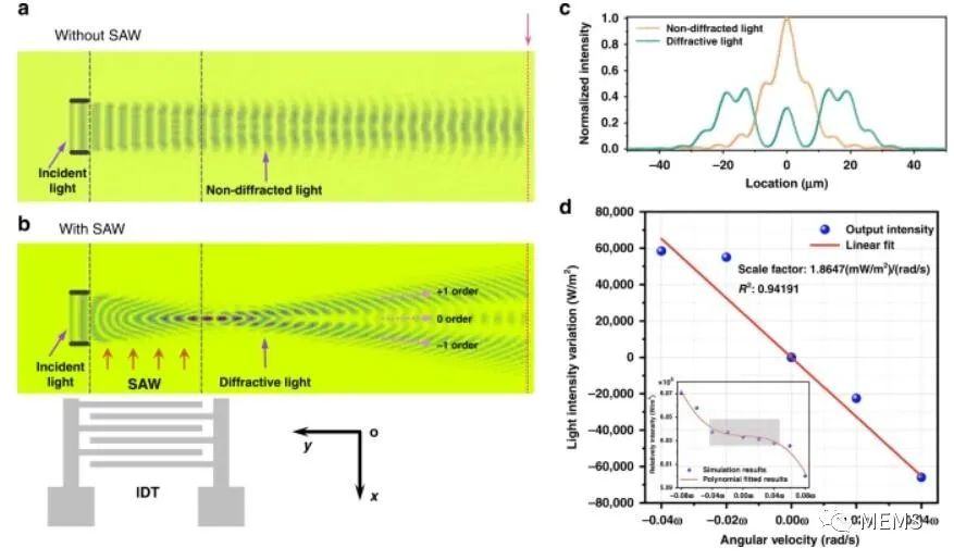 然而,盡管SAW陀螺儀作為一種傳感機(jī)制具有巨大的潛力,但它仍然面臨許多挑戰(zhàn),例如測(cè)量限制、靈敏度下降以及溫度補(bǔ)償?shù)?。幸運(yùn)的是,光學(xué)探測(cè)方法為其提供了一種改進(jìn)性能的新方法,其高靈敏度、高穩(wěn)定性和低噪聲特性有助于精確測(cè)量。根據(jù)聲光效應(yīng),光學(xué)探測(cè)方法和SAW技術(shù)可以結(jié)合起來測(cè)量固體介質(zhì)中機(jī)械應(yīng)變引起的折射率變化,實(shí)現(xiàn)陀螺面外角速度檢測(cè)。