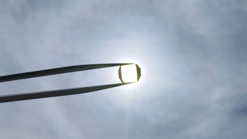 光線穿過一個金剛石傳感器,該傳感器是測量磁場的陽光驅動型量子設備的核心。