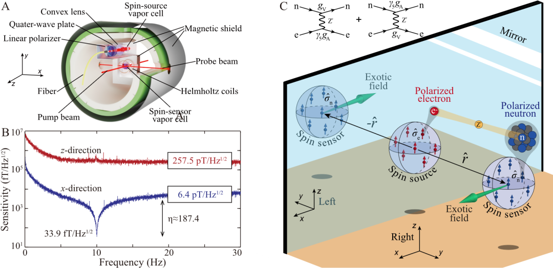 彭新華教授研究組利用近期發(fā)展的量子自旋放大器技術(shù)(圖1A)[Nat. Phys. 17, 1402–1407 (2021)],實(shí)現(xiàn)了對待測磁信號2個(gè)數(shù)量級的放大(圖1B),并將其應(yīng)用于超越標(biāo)準(zhǔn)模型的新粒子與新相互作用的搜尋,在國際上提出了“藍(lán)寶石”研究計(jì)劃,英文縮寫SAHPPHIRE(SpinAmplifier for Particle PHysIcs REsearch)。該計(jì)劃的首批實(shí)驗(yàn)約束了一種由Z玻色子誘導(dǎo)的自旋相互作用,如圖1C所示,此類奇異相互作用是宇稱不守恒的,其強(qiáng)度正比于自旋源內(nèi)的電子自旋數(shù)量。因此本實(shí)驗(yàn)采用了兩個(gè)原子氣體室,一個(gè)利用惰性氣體氙原子作為自旋傳感器,一個(gè)利用堿金屬銣原子作為自旋源。自旋源內(nèi)的堿金屬原子通過激光泵浦實(shí)現(xiàn)約1014的電子極化自旋數(shù)量,并由泵浦光間斷極化,從而產(chǎn)生一個(gè)交流的震蕩奇異場作用于量子自旋傳感器上,并被進(jìn)一步放大和探測。