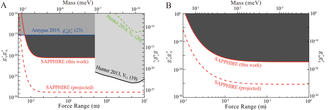 相較于其他應(yīng)用于新物理搜尋的共振技術(shù),量子自旋放大器中的銣原子充當(dāng)嵌入式磁強(qiáng)計(jì),實(shí)現(xiàn)了惰性氣體氙原子的連續(xù)極化和原位測量。相比之下,原位測量提供的一個(gè)顯著優(yōu)勢是由于大費(fèi)米接觸放大因子而增強(qiáng)核共振信號。此外,由于氙核自旋通過與極化銣原子的自旋交換碰撞而連續(xù)極化,自旋放大器可實(shí)現(xiàn)對奇異場的連續(xù)搜索。由于這些獨(dú)特的優(yōu)點(diǎn),自旋放大器更適用于奇異相互作用的超靈敏連續(xù)波檢測。正因如此,本實(shí)驗(yàn)對電子與中子之間的宇稱破缺奇異相互作用的約束較國際前沿實(shí)驗(yàn)界限提高了5個(gè)數(shù)量級(如圖2A),且對中子與質(zhì)子之間的奇異相互作用進(jìn)行了首次探索(如圖2B)。不僅如此,SAPPHIRE計(jì)劃仍有很大的性能提升空間,研究人員提出利用K-3He自旋放大器與固體自旋源,有望將對此類奇異相互作用的實(shí)驗(yàn)約束界限進(jìn)一步提升8個(gè)量級。
