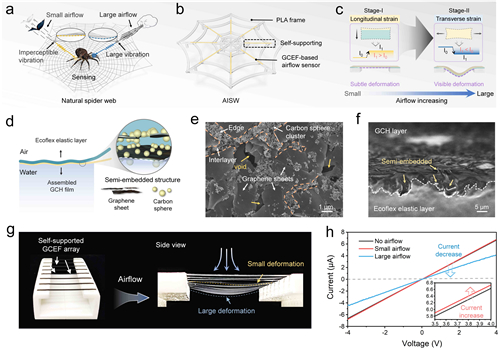 近期,中國(guó)科學(xué)院寧波材料技術(shù)與工程研究所智能高分子材料團(tuán)隊(duì)陳濤研究員和肖鵬副研究員基于在碳基/高分子復(fù)合薄膜的構(gòu)筑及其柔性傳感器方面的研究基礎(chǔ),受自然蜘蛛網(wǎng)徑線感應(yīng)氣流能力的啟發(fā),通過(guò)碳基雜化材料和自支撐結(jié)構(gòu)設(shè)計(jì),實(shí)現(xiàn)了同時(shí)具有超低氣流檢測(cè)下限和超寬感應(yīng)范圍的氣流傳感器。