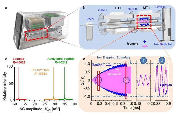 圖1. 離子云掃描分析技術(shù)的儀器設(shè)置、原理和性能表征。(a)Mini β質(zhì)譜儀器系統(tǒng)。(b)實驗裝置示意圖。(c)離子云掃描技術(shù)原理。強迫振動下的兩種異構(gòu)體離子(紫色和藍(lán)色)的離子軌跡。(d)獲得的離子云掃描譜圖。