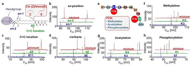 圖3. 脂質(zhì)與多肽異構(gòu)體分析。(a)脂質(zhì)異構(gòu)方式示意圖。各種脂質(zhì)異構(gòu)體的離子云掃描譜圖:(b)sn異構(gòu)、(c)碳碳雙鍵位置異構(gòu)和(d)雙鍵順反異構(gòu)。(e)多肽的不同翻譯后修飾類型及其異構(gòu)方式示意圖。不同翻譯后修飾類型的多肽異構(gòu)體離子云掃描譜圖:(f)甲基化、(g)乙?;停╤)磷酸化。