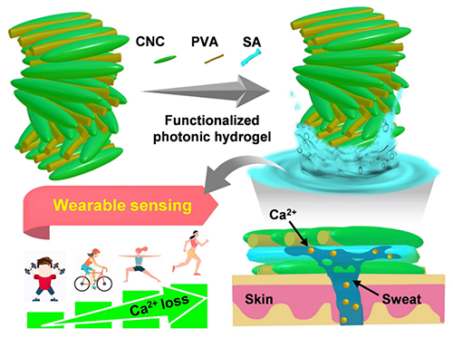 本工作中,團隊發(fā)展了一種制造不溶性CNC基水凝膠的簡單且有效的方法,利用分子間氫鍵重構(gòu),熱脫水使優(yōu)化的CNC復(fù)合光子膜在水溶液中形成一個穩(wěn)定的水凝膠網(wǎng)絡(luò)。研究發(fā)現(xiàn),該水凝膠在干濕狀態(tài)之間可以可逆轉(zhuǎn)換,便于進行特定的功能化處理。團隊通過在液體環(huán)境下吸附溶脹引入功能化分子,得到了具有抗凍性(-20℃)、強粘附性、良好生物相容性、對Ca2+高靈敏度和高選擇性感應(yīng)的水凝膠。該工作有望促進利用可持續(xù)纖維素傳感器監(jiān)測其他代謝物(即葡萄糖、尿素和維生素等)的應(yīng)用,并為在環(huán)境監(jiān)測、膜分離和可穿戴設(shè)備中運行的數(shù)控水凝膠系統(tǒng)奠定了基礎(chǔ)。