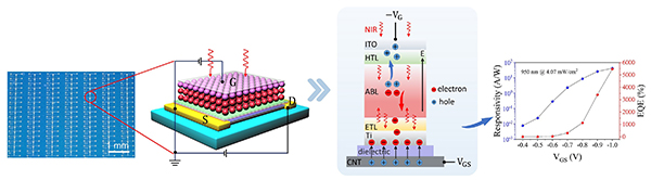 PbS膠體量子點(diǎn)是開(kāi)發(fā)下一代高性能近紅外光電探測(cè)器的有力候選者。然而,由于配體隔離以及表面缺陷的存在,PbS量子點(diǎn)通常表現(xiàn)出低的載流子遷移率,這限制了量子點(diǎn)光電子器件性能的進(jìn)一步提升。針對(duì)這一問(wèn)題,曹覺(jué)先教授和黃凱教授團(tuán)隊(duì)通過(guò)合理的設(shè)計(jì),將PbS膠體量子點(diǎn)光電二極管和碳納米管薄膜場(chǎng)效應(yīng)晶體管成功結(jié)合,實(shí)現(xiàn)了一種具有光敏感柵極的晶體管型近紅外探測(cè)器。光生電子與空穴在負(fù)柵壓與內(nèi)建電場(chǎng)的雙重作用下能快速分離與轉(zhuǎn)移,聚積在柵極電介質(zhì)層界面的光生電子能產(chǎn)出等效柵電容效應(yīng)開(kāi)啟碳基晶體管,從而實(shí)現(xiàn)光信號(hào)向電信號(hào)的轉(zhuǎn)換。該項(xiàng)研究提出在光電轉(zhuǎn)換器件中光學(xué)模塊和電學(xué)模塊相互分離的結(jié)構(gòu),可以同時(shí)發(fā)揮PbS量子點(diǎn)光學(xué)和碳納米管電學(xué)的優(yōu)勢(shì)。