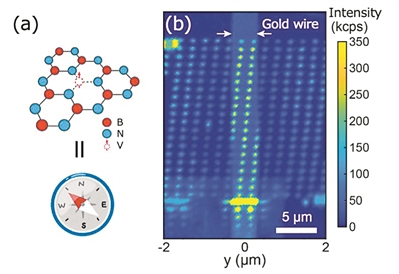 (a)六方氮化硼中的硼空位缺陷??瘴豢沙洚?dāng)用于磁場(chǎng)測(cè)量的原子大小的量子傳感器,對(duì)磁場(chǎng)敏感,就像一個(gè)納米“磁針”。(b)量子傳感器納米陣列的光致發(fā)光可反應(yīng)磁場(chǎng)的變化。圖片來源:東京大學(xué)研究團(tuán)隊(duì)