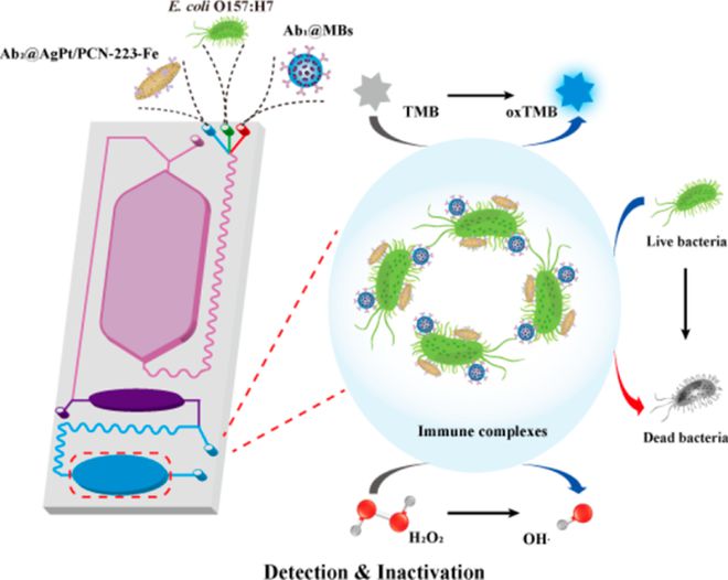 清華大學林金明利用免疫磁珠(IMBs)和AgPt納米粒子修飾的PCN-223-Fe(AgPt/PCN-223-Fe,PCN代表多孔配位網(wǎng)絡)金屬-有機框架(MOFs),開發(fā)了一種“感知和治療”生物傳感器。AgPt/PCN-223-Fe不僅具有優(yōu)異的過氧化物酶樣活性,而且在近紅外輻射下能有效殺滅細菌。該生物傳感器能夠在103-108 CFU/mL范圍內對大腸桿菌O157:H7進行比色檢測,檢測限為276 CFU/mL,具有高選擇性、良好的再現(xiàn)性和在不同真實樣品中的廣泛適用性。在808 nm光照20 min下對大腸桿菌O157:H7具有99.94%的高效抗菌率。相關工作以“Portable Biosensor with Bimetallic metal-Organic frameworks for Visual Detection and Elimination of Bacteria”為題發(fā)表在國際著名期刊Analytical Chemistry上。