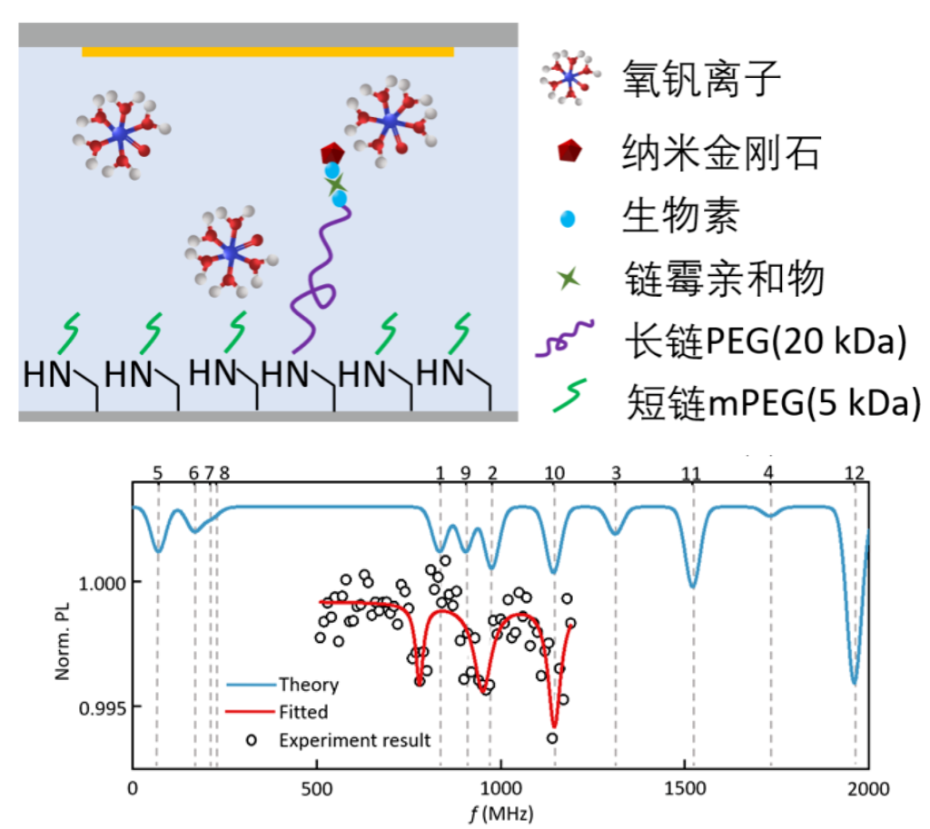 研究人員在原位條件下,用長鏈分子將納米金剛石“拴”在基底上,限制其平動(dòng)范圍,但保留其轉(zhuǎn)動(dòng)自由度。這種納米金剛石可以深入目標(biāo)內(nèi)部進(jìn)行探測。實(shí)驗(yàn)中選定被測目標(biāo)為氧釩離子溶液。當(dāng)納米金剛石存在轉(zhuǎn)動(dòng)時(shí),難以對(duì)NV色心進(jìn)行精確的量子操控,但應(yīng)用幅度調(diào)制微序列,依然能夠測得氧釩離子的零場順磁共振譜。這一結(jié)果從原理上證明了用納米金剛石中的NV色心實(shí)現(xiàn)細(xì)胞內(nèi)生理原位磁共振探測是可行的。