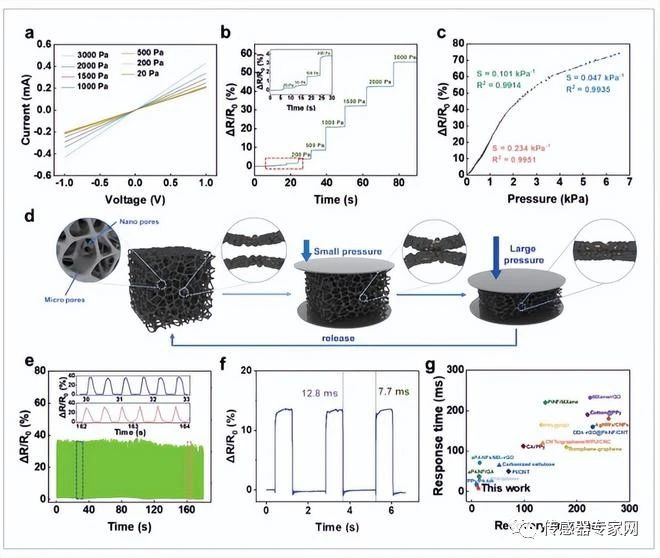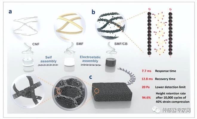 超彈性氣凝膠具有快速響應(yīng)和恢復(fù)時(shí)間,以及即使在大變形下也能具有出色的形狀恢復(fù)性能,在可穿戴傳感器應(yīng)用中需求量很大。本文,哥倫比亞大學(xué)Penghui Zhu、Feng Jiang等研究人員在《Small》期刊發(fā)表名為“Superelastic Cellulose Sub-Micron Fibers/Carbon Black Aerogel for Highly Sensitive Pressure Sensing”的論文,研究成功研制了一種新型導(dǎo)電超彈性纖維素基氣凝膠。氣凝膠結(jié)合了纖維素亞微米纖維和炭黑 (SMF/CB) 納米顆粒的網(wǎng)絡(luò),通過雙冰模板組裝和靜電組裝方法的結(jié)合實(shí)現(xiàn)。組裝的纖維素亞微米纖維的摻入賦予氣凝膠顯著的超彈性,使其即使在經(jīng)歷 94 次壓縮/恢復(fù)循環(huán)后仍能保持其原始高度的 6.10%。