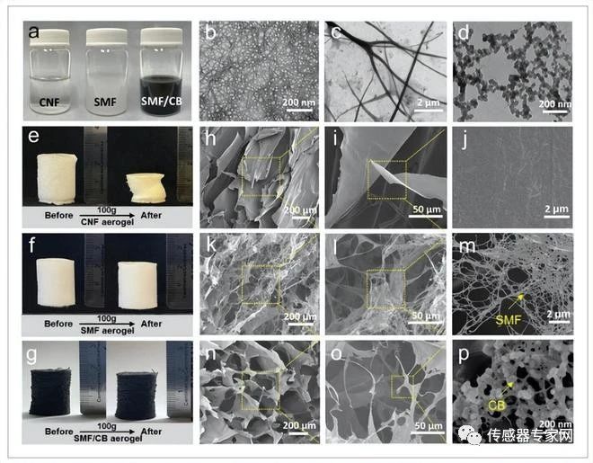 圖2、CNF、SMF 和 SMF/CB 懸浮液和氣凝膠的形態(tài)表征