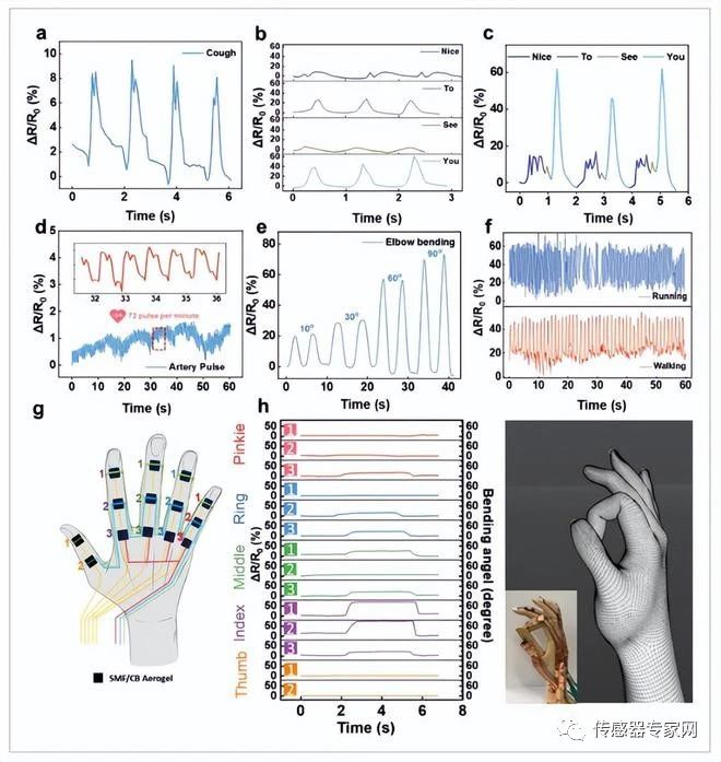圖5、SMF/CB氣凝膠在檢測(cè)各種人體運(yùn)動(dòng)中的應(yīng)用演示