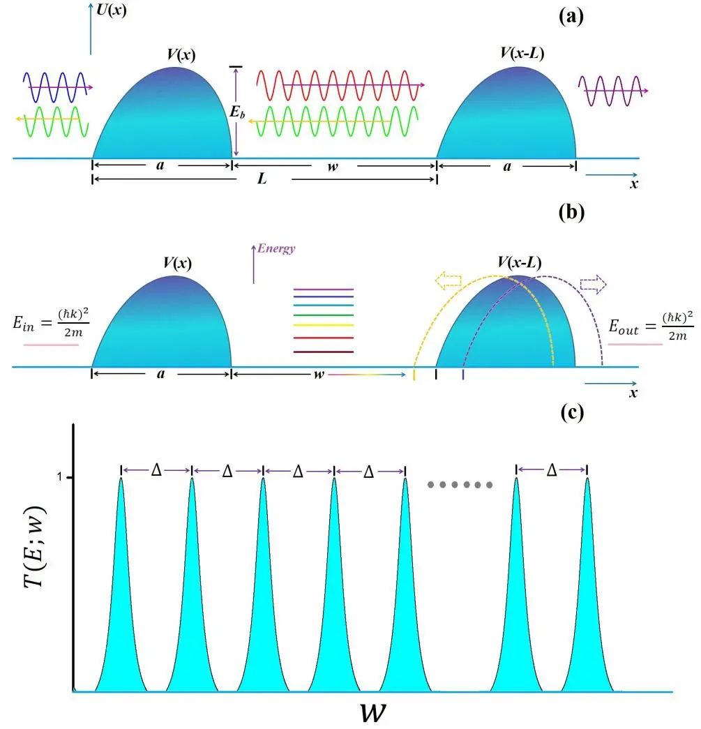 圖1. (a) 雙勢(shì)壘之間的量子干涉及隧穿現(xiàn)象;(b) 通過改變勢(shì)壘間距調(diào)控共振能級(jí);(c) 給定能量下的量子隧穿概率隨勢(shì)壘間距的分布。