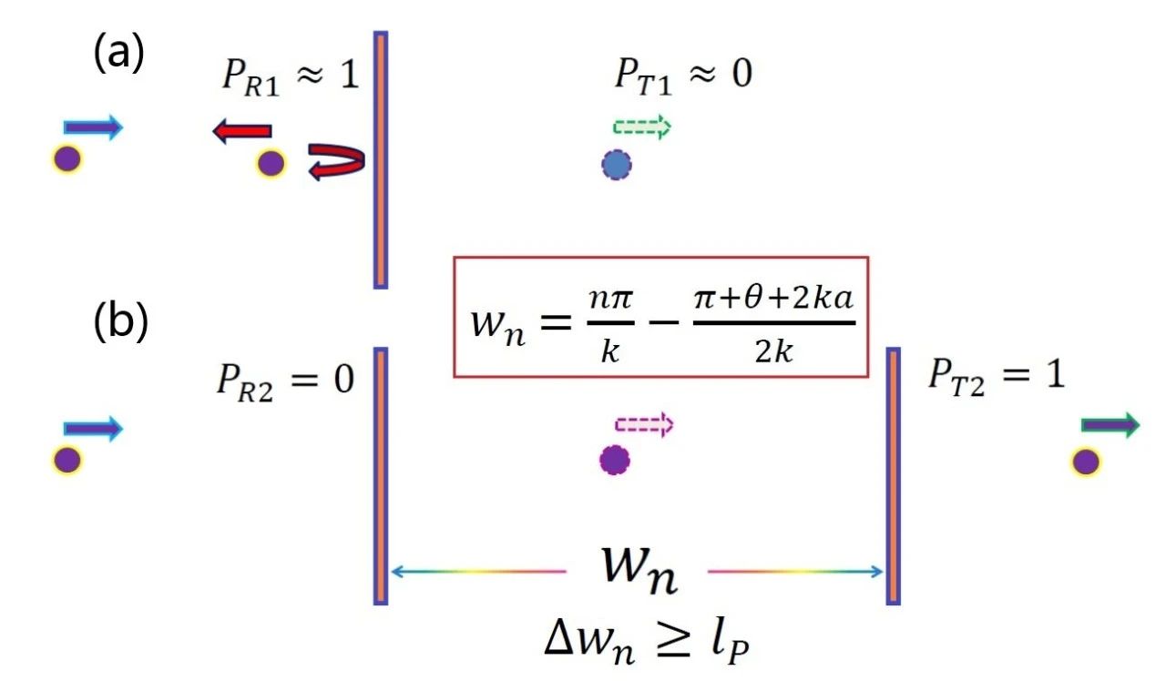 圖2. (a)微觀粒子被單勢(shì)壘幾乎完全反射;(b)滿足給定勢(shì)壘間距的條件下,同樣的微觀粒子在雙勢(shì)壘之間發(fā)生共振隧穿。其中,勢(shì)壘變化步長(zhǎng)不小于普朗克長(zhǎng)度lP。