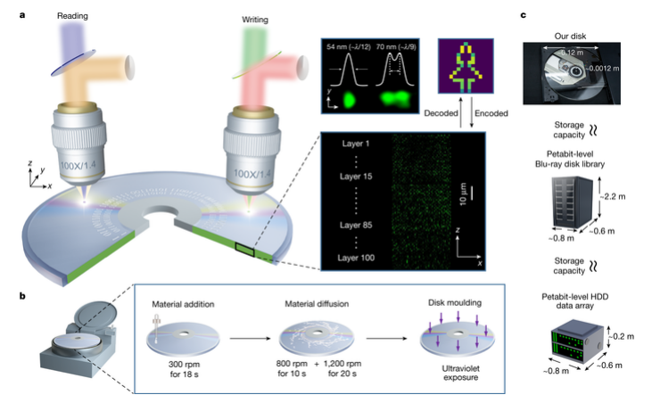圖1 Pb級光盤制備及讀寫方式示意圖(圖源:Nature)
