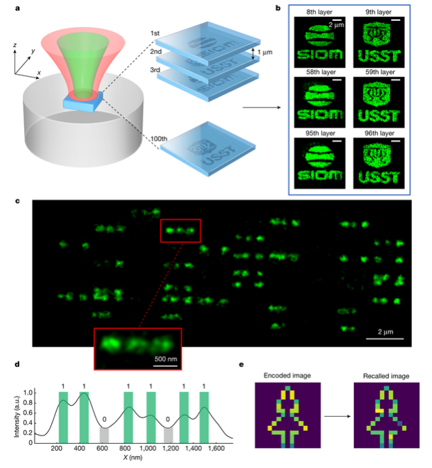 近日,中國科學(xué)院上海光學(xué)精密機(jī)械研究所(以下簡稱“上海光機(jī)所”)與上海理工大學(xué)等科研單位合作,在超大容量超分辨三維光存儲(chǔ)研究中取得突破性進(jìn)展。研究團(tuán)隊(duì)利用國際首創(chuàng)的雙光束調(diào)控聚集誘導(dǎo)發(fā)光超分辨光存儲(chǔ)技術(shù),實(shí)驗(yàn)上首次在信息寫入和讀出均突破了衍射極限的限制,實(shí)現(xiàn)了點(diǎn)尺寸為54nm、道間距為70nm的超分辨數(shù)據(jù)存儲(chǔ),并完成了100層的多層記錄,單盤等效容量達(dá)Pb量級,對于我國在信息存儲(chǔ)領(lǐng)域突破關(guān)鍵核心技術(shù)、實(shí)現(xiàn)數(shù)字經(jīng)濟(jì)的可持續(xù)發(fā)展具有重大意義。相關(guān)研究成果于2024年2月22日發(fā)表在《自然》(Nature)雜志。論文第一作者單位為上海光機(jī)所,通訊作者為上海光機(jī)所阮昊研究員和上海理工大學(xué)光子芯片研究院院長顧敏院士,上海理工大學(xué)文靜教授。上海光機(jī)所博士后趙苗和上海理工大學(xué)文靜教授為并列第一作者。