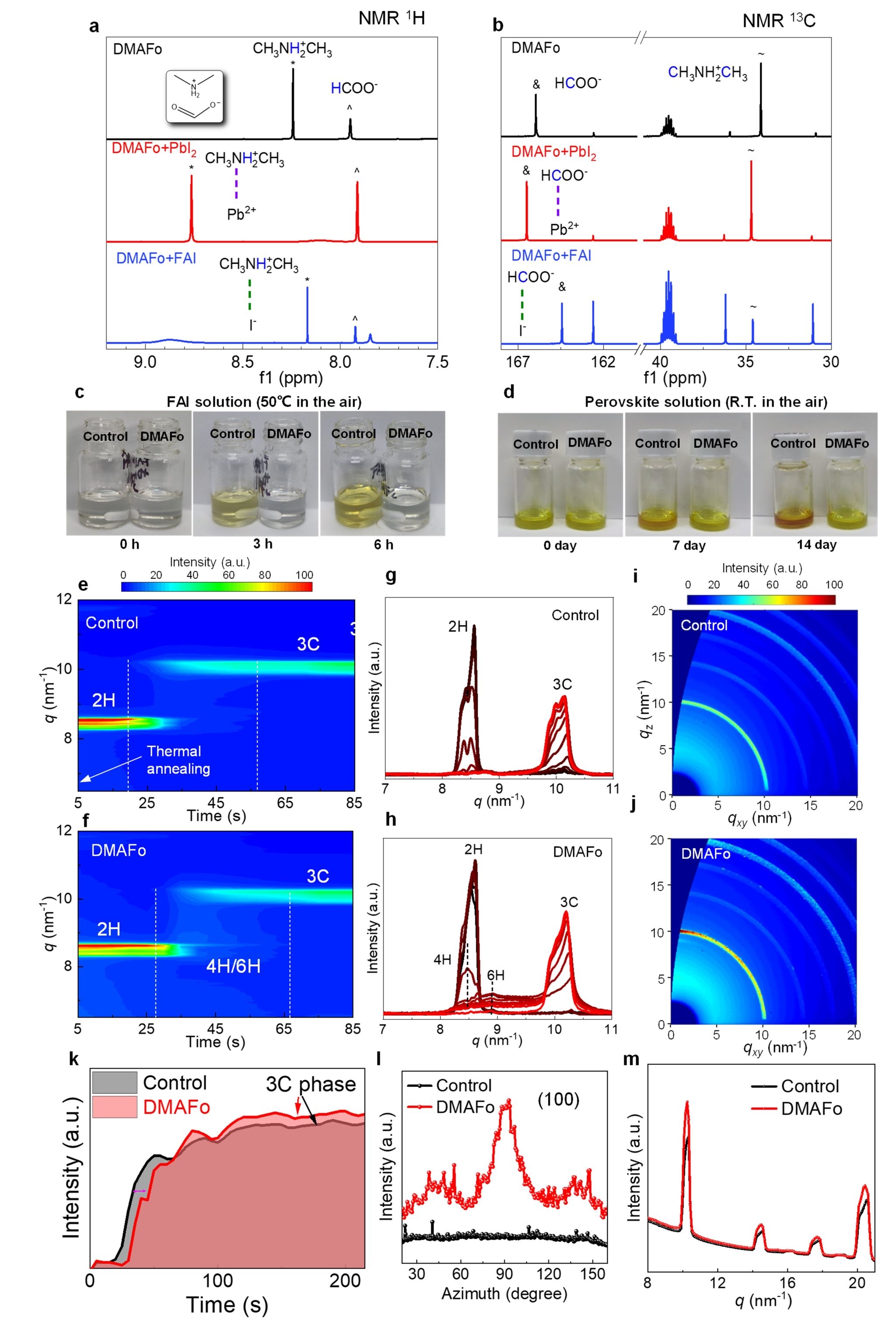 圖1. (a, b)鈣鈦礦前驅(qū)體溶液的核磁譜圖;(c, d)前驅(qū)體溶液的空氣穩(wěn)定性;(e, f)原位GIWAXS研究結(jié)晶過程;(g, h)GIWAXS剖面圖;(i, j)鈣鈦礦薄膜最終結(jié)晶的GIWAXS圖;(k)鈣鈦礦薄膜結(jié)晶GIWAXS強(qiáng)度積分曲線,(l)角度積分圖,(m)徑向積分圖。