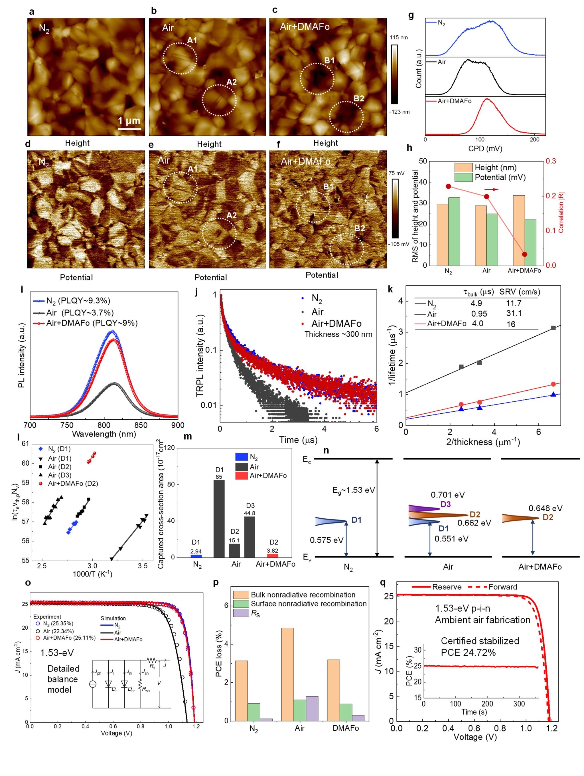 針對(duì)以上問題,中國科大徐集賢教授團(tuán)隊(duì)合成了一種離子液體型的“全過程”穩(wěn)定劑——甲酸二甲基胺(DMAFo)。DMAFo的還原作用以及它與鈣鈦礦前體的配位鍵和氫鍵(圖1.a-d)抑制了有機(jī)陽離子的去質(zhì)子化和鹵素離子的氧化,使鈣鈦礦溶液能夠在空氣環(huán)境和加熱條件下長(zhǎng)期儲(chǔ)存。此外,這種保護(hù)作用可以延續(xù)至空氣中的鈣鈦礦結(jié)晶過程,提高鈣鈦礦薄膜的結(jié)晶度(圖1.e-m),降低局部孿晶產(chǎn)生和晶粒間表面電勢(shì)無序度(圖2. a-h),抑制缺陷誘導(dǎo)的非輻射復(fù)合(圖2.i-k)。重要的是,綜合缺陷表征與器件仿真模擬同時(shí)指出(圖2. l-p):體相缺陷、而非表面缺陷的增殖是空氣中制備的鈣鈦礦性能退化的主要原因。該發(fā)現(xiàn)證明了僅進(jìn)行常規(guī)的表面鈍化對(duì)于空氣環(huán)境制備鈣鈦礦是不足的?;谝陨线M(jìn)步,團(tuán)隊(duì)在空氣環(huán)境中制造的1.53-eV p-i-n器件獲得了25.4%的實(shí)驗(yàn)室最高效率和24.7%的穩(wěn)態(tài)認(rèn)證效率(圖2q),接近氮?dú)庵兄苽涞耐N器件最好水平。同時(shí),研究團(tuán)隊(duì)也確認(rèn)了該技術(shù)在寬帶隙鈣鈦礦材料中的普適性,對(duì)疊層器件的空氣環(huán)境制備也具有良好推動(dòng)意義。