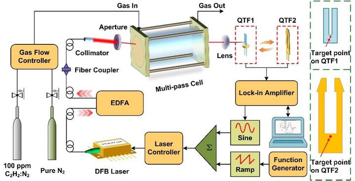 為提高光致熱彈光譜傳感性能,課題組從增大激光功率、增加氣體吸收程和使用新型低頻石英音叉探測3個維度對氣體傳感系統(tǒng)進(jìn)行優(yōu)化升級,實現(xiàn)了對目標(biāo)氣體的高靈敏度測量。課題組通過使用摻鉺光纖放大器增大激光功率,并設(shè)計了一個新型的光斑密集型光學(xué)多通池作為氣體吸收池,同時為了獲得更大的探測信號,設(shè)計了一款新型的低頻石英音叉作為探測元件,與常見的商用石英音叉相比,頻率下降了約70%,并能提供更長的能量積累時間,極大提升了光致熱彈光譜系統(tǒng)的檢測性能。課題組依據(jù)濃度測試結(jié)果,證明了系統(tǒng)具有優(yōu)異的濃度線性響應(yīng),使用新型石英音叉的探測靈敏度更高,檢測性能是使用商用石英音叉的近2倍。