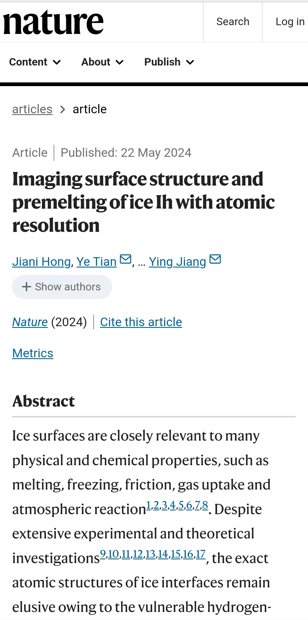 利用自主研發(fā)、依托中科艾科米公司轉(zhuǎn)化的國產(chǎn)qPlus型掃描探針顯微鏡,北京大學(xué)江穎教授、徐莉梅教授、王恩哥院士聯(lián)合研究團(tuán)隊首次獲得了六角冰(自然界最常見的冰)表面的原子級分辨圖像。該成果5月22日發(fā)表于《自然》雜志。