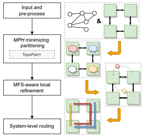 為解決因多FPGA系統(tǒng)拓?fù)?、TDM等因素導(dǎo)致劃分后電路時(shí)序性能下降的問(wèn)題,研究團(tuán)隊(duì)在 MaPart: An Efficient Multi-FPGA System-Aware Hypergraph Partitioning framework 論文中創(chuàng)新性地提出了一個(gè)零違例的高效劃分器TopoPart+,該劃分器被集成在一個(gè)二分查找的算法框架中,實(shí)現(xiàn)最小hop的初始劃分方案,進(jìn)而在拓?fù)涓兄蛽砣窂津?qū)動(dòng)的改善下得到細(xì)化的高質(zhì)量劃分結(jié)果。為控制布線階段的hop的延時(shí),團(tuán)隊(duì)還巧妙地結(jié)合分層圖思想實(shí)現(xiàn)了布線算法。這一系列突破性的工作極大地提升了電路仿真時(shí)序性能,展現(xiàn)了在時(shí)序驅(qū)動(dòng)的劃分的重要進(jìn)展。該成果論文于2024年4月被計(jì)算機(jī)輔助設(shè)計(jì)領(lǐng)域頂級(jí)國(guó)際學(xué)術(shù)期刊TCAD(IEEE Transactions on Computer-Aided Design of Integrated Circuits and Systems)錄用并出版,該工作的第一作者為集成電路學(xué)部2020級(jí)博士研究生李本正,第二作者為2022級(jí)博士研究生畢舜陽(yáng),游海龍教授為通訊作者,西安電子科技大學(xué)為第一完成單位。