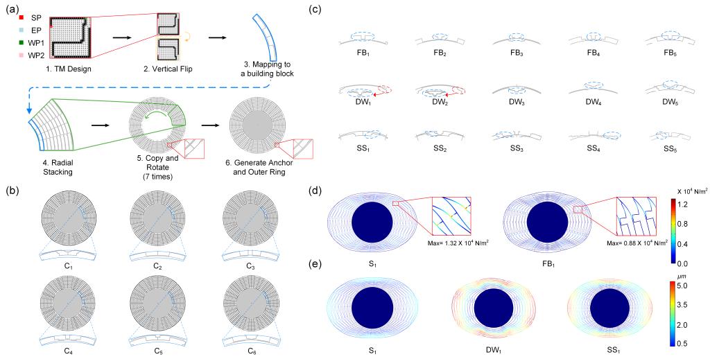 圖(c)創(chuàng)新性拓撲設(shè)計范式,其中FBi為彈性梁結(jié)構(gòu)、DWi為雙翼式結(jié)構(gòu)、SSi為步進階梯式結(jié)構(gòu);
