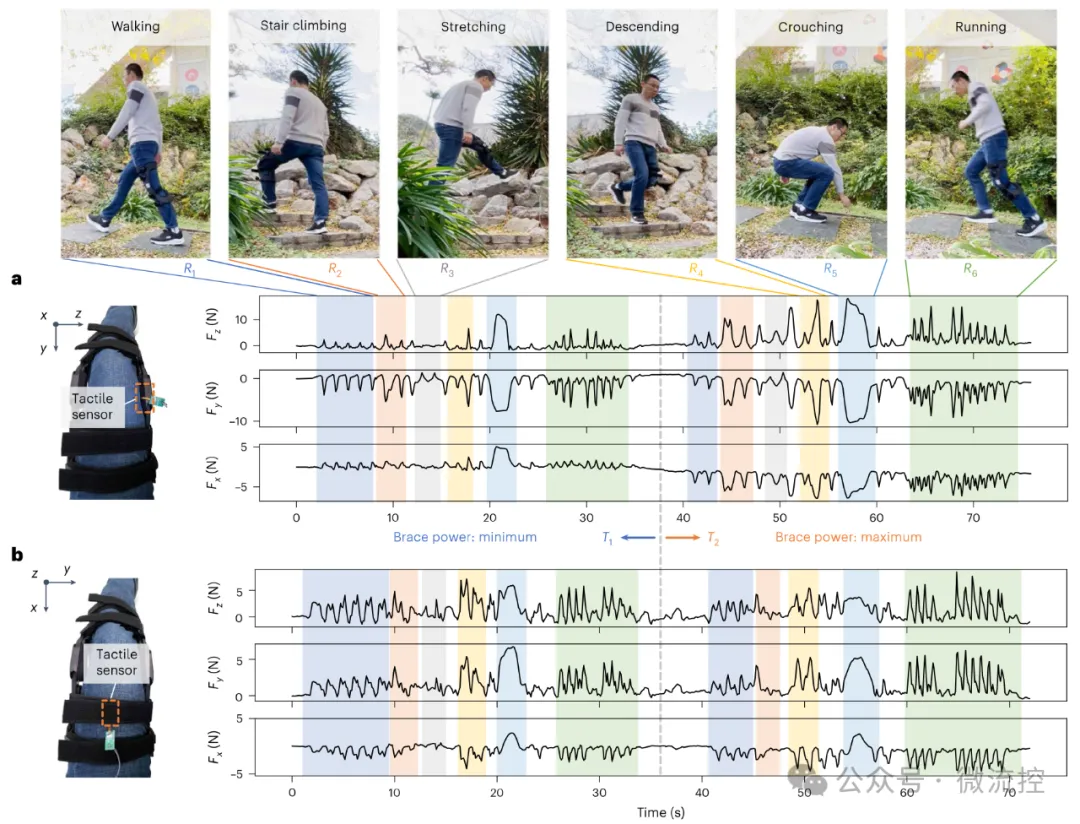 研究人員還展示了柔性PCB基底的觸覺(jué)傳感器在可穿戴設(shè)備中的應(yīng)用。如下圖所示,通過(guò)將一個(gè)具有柔性PCB基底的觸覺(jué)傳感單元放置于膝蓋支架(knee brace)內(nèi)側(cè),我們可以監(jiān)測(cè)使用者在日?;顒?dòng)過(guò)程中膝蓋支架與腿部的三維接觸力,這展示了三維柔性觸覺(jué)傳感器在健康監(jiān)測(cè)領(lǐng)域的潛在應(yīng)用。