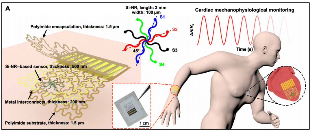 借此展示了一種可植入和可穿戴的應(yīng)變片設(shè)備,其結(jié)合了多個(gè)超薄單晶硅傳感器,能夠用于動(dòng)態(tài)地監(jiān)測(cè)生物組織表面的多方向應(yīng)變分布。
