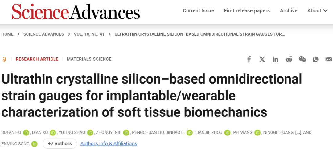 日前,相關(guān)論文以《基于超薄晶體硅的全向應(yīng)變計(jì),用于可植入/可穿戴軟組織生物力學(xué)的表征》(Ultrathin crystalline silicon–based omnidirectional strain gauges for implantable/wearable characterization of soft tissue biomechanics)為題發(fā)在 Science Advances[1]。