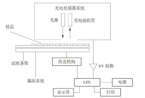 尿液分析儀一般由試帶、機械系統(tǒng)、光學系統(tǒng)、電路系統(tǒng)、輸入輸出系統(tǒng)等部分組成。