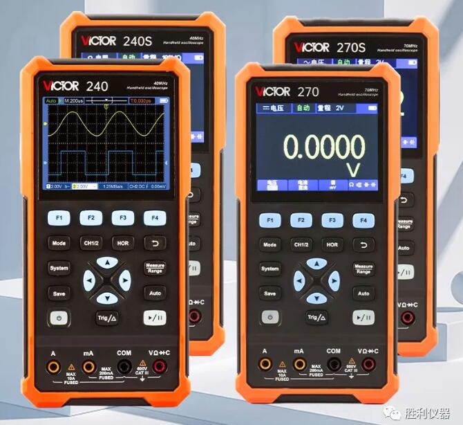 VICTOR 240/240S/270/270S雙通道手持式示波表 示波器、萬用表、信號源三合一VICTOR 240/240S/270/270S是一款經(jīng)濟(jì)型的手持式數(shù)字示波器,其集示波器、萬用表(S型產(chǎn)品帶信號源功能)功能于一體,外形小巧輕便、可單手