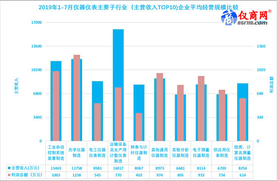 12、 2019年1-7月儀器儀表主要子行業(yè)(主營收入TOP10)企業(yè)平均經(jīng)營規(guī)模比較