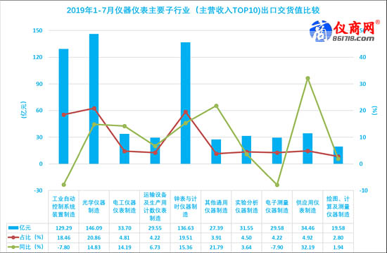13、2019年1-7月儀器儀表主要子行業(yè)(主營收入TOP10)出口交貨值比較