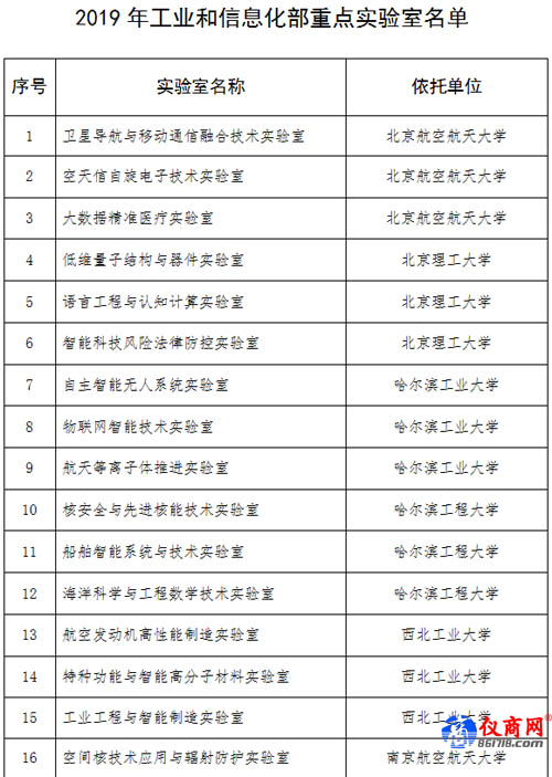 昨日,工業(yè)和信息化部發(fā)布通知:依據(jù)《工業(yè)和信息化部重點實驗室管理暫行辦法》(工信部科〔2014〕515號),經(jīng)評審和公示(公示期為2019年9月11日—2019年9月19日),現(xiàn)將2019年工業(yè)和信息化部重點實驗室正式名單予以公布。