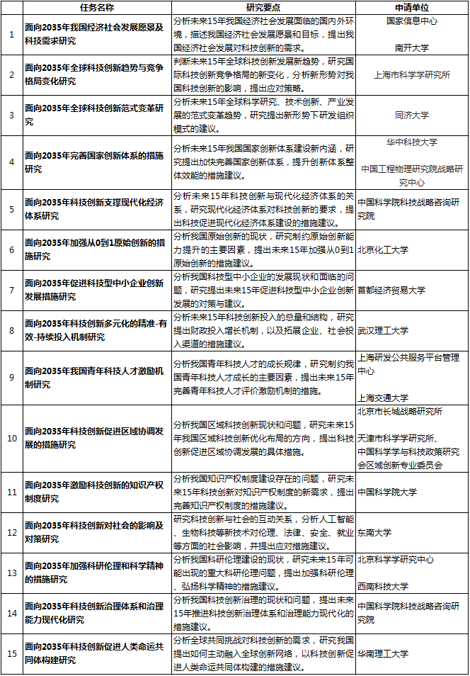 自9月30日,國家科技部公布了國家中長期科技發(fā)展規(guī)劃面向社會征集研究單位開展重大問題研究的公告,據(jù)了解,截至10月21日共收到189份課題申請書。在科技部主導(dǎo)下,經(jīng)專家嚴格評審,面向15個研究方向遴選了20個任務(wù)的承擔單位參與國家中長期科技發(fā)展規(guī)劃研究(為集思廣益、開闊視野,部分重點研究任務(wù)同期委托兩個單位并行開展研究)。