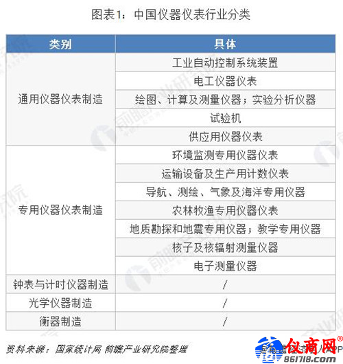儀器儀表應(yīng)用領(lǐng)域廣泛,覆蓋了工業(yè)、農(nóng)業(yè)、交通、科技、環(huán)保、國防、文教衛(wèi)生、人民生活等各方面,在國民經(jīng)濟建設(shè)各行各業(yè)的運行過程中承擔(dān)著把關(guān)者和指導(dǎo)者的任務(wù)。根據(jù)《國民經(jīng)濟行業(yè)分類》(GB/T4754-2017),儀器儀表制造行業(yè)可以分為通用儀表儀器制造、專用儀器儀表制造、鐘表與計時儀器制造、光學(xué)儀器制造和衡器制造。